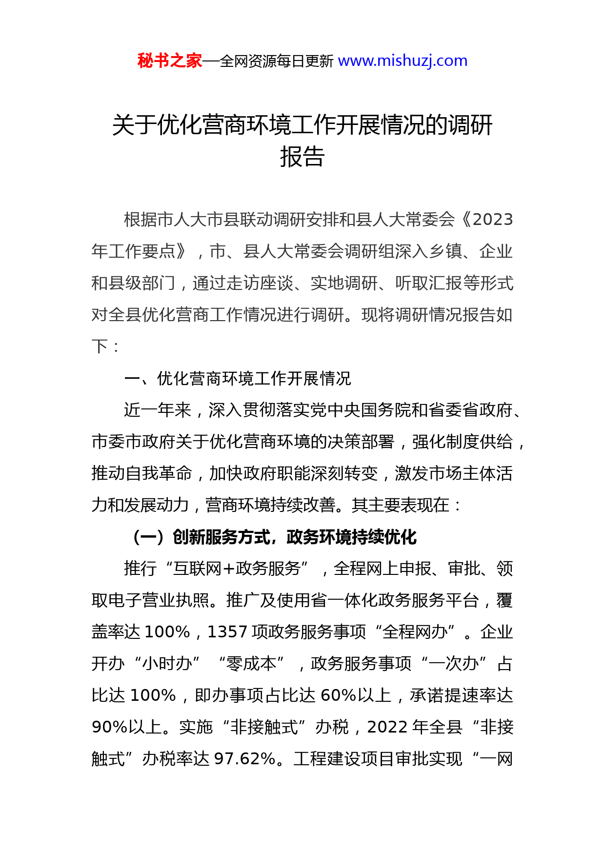 秘书之家—全网资源每日更新www.mishuzj.com关于优化营商环境工作开展情况的调研报告根据市人大市县联动调研安排和县人大常委会《2023年工作要点》,市、县人大常委会调研组深入乡镇、企业和县级部门,通过走访座谈、实地调研、听取汇报等形式对全县优化营商工作情况进行调研。现将调研情况报告如下:一、优化营商环境工作开展情况近一年来,深入贯彻落实党中央国务院和省委省政府、市委市政府关于优化营商环境的决策部署,强化制度供给,推动自我革命,加快政府职能深刻转变,激发市场主体活力和发展动力,营商环境持续改善。其主要表现在:(一)创新服务方式,政务环境持续优化推行“互联网+政务服务”,全程网上申报、审批、领取电子营业执照。推广及使用省一体化政务服务平台,覆盖率达100%,1357项政务服务事项“全程网办”。企业开办“小时办”“零成本”,政务服务事项“一次办”占比达100%,即办事项占比达60%以上,承诺提速率达90%以上。实施“非接触式”办税,2022年全县“非接触式”办税率达97.62%。工程建设项目审批实现“一网秘书之家—全网资源每日更新www.mishuzj.com进出”“全程网办”。设“无差别”综合窗口,编印《综合受理窗口材料清单》。在园区设行政审批“专窗”,实现涉企“不出园”服务。投资1500万元标准化升级改造政务服务大厅。(二)强化资金支持,市场环境持续向好运用央行再贷款,为“三农”、普惠小微企业、个体工商户等提供5.65亿低成本贷款。发放麦冬贷、生猪养殖贷等产业链贷款余额4.65亿元。发放38户915万元创业担保贷款。落实中央减税降费金额3.54亿元,兑现各级财政各项政府奖励及招商引资承诺资金8220.9万元。为担保对象降低担保费104.56万元。对企业在融资活动中产生的评估费、登记费等应免尽免。(三)严格执纪执法,营商环境持续净化开展“春雷行动”“铁拳行动”等专项行动,切实整顿和规范市场秩序,查办案件325件。搭建5G参审室和涉企服务站,开通营商环境服务热线,进一步畅通诉求。出台《“清淤治乱·清风护航”优化营商环境专项行动实施方案》,设7个检测工作组,15个检测点,保持对破坏营商环境问题的高压态势。通过绵阳公共信用信息平台,将行政许可和行政处罚信息准确、合法、及时、无遗漏双公示信息50974条。二、存在的主要问题秘书之家—全网资源每日更新www.mishuzj.com(一)思想认识不到位。个别部门关注经济发展和基础建设硬指标,对优化营商环境重要性认识不足,重“有”不重“优”。在人员配备、制度建设、工作方法等方面未“下深水”。个别工作人员因业务不熟,工作存在瑕疵或失误。(二)信息资源需整合。各部门,甚至各处室信息系统相对独立,互不联通,相互间无法实现业务协同,办理事项时需要重复录入,影响效率,造成资源浪费。(三)要素保障有短板。入夏以来,拉闸限电、错峰停水现象相比往年频次更多、时间更长,影响企业正常生产。三、工作建议(一)持续传导工作压力。加强教育引导,在全县营造崇尚创业、爱商护商良好氛围。将优化营商环境工作纳入日常重要工作考核。主要领导亲自抓,县级主管部门加强督查。拓展营商环境监督深度广度,充分调动“两代表一委员”、企业家、新闻媒体等各方监督积极性,严格考核督查结果利用,倒逼在力量配备、方法创新、机制建设等方面向好向优。配强行政审批服务力量,加强业务培训提高服务质效。(二)积极整合信息资源。下大力打通数据和信息壁垒,配合市级建好用好营商环境监测平台,实现各部门、秘书之家—全网资源每日更新www.mishuzj.com各层级、各业务系统数据信息互联互通、充分共享,最大程度促进资源整合利用,提高办事效率。加快推进政务服务电子化和网络化发展。进一步优化、创建服务平台,推进实体政务大厅和网上服务平台融合,推动服务事项跨地区全程办理、跨层级联动办理、跨部门协同办理。(三)做好生产要素保障。县人民政府要召集有关部门认真研究我县企业发展要素保障,特别是我县电力供应紧张问题,加快研究并入国网,从根本上解决国民经济和社会发展能源供应。协调土地、环保、税收等职能部门依法支持企业发展,解决企业生产后顾之忧,确保企业正常生产。