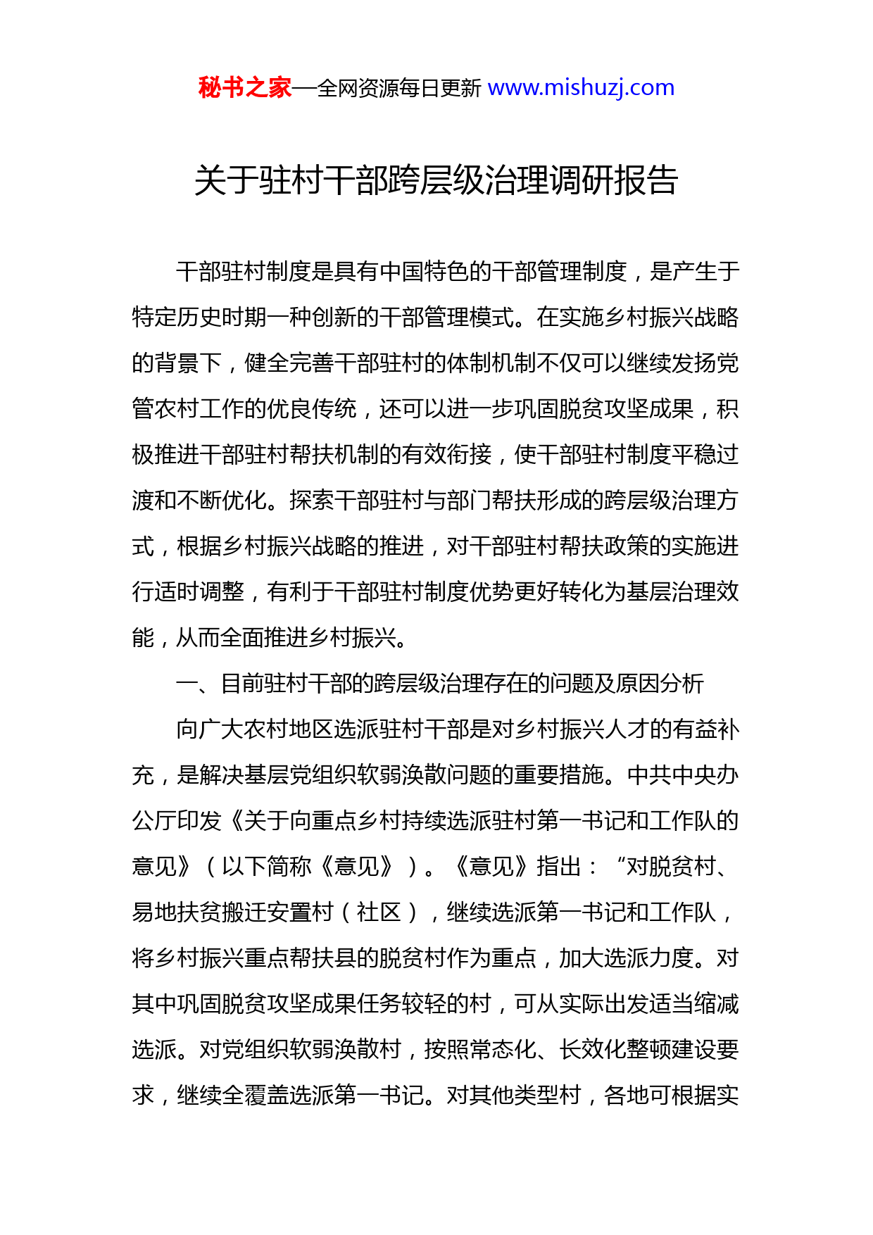 秘书之家—全网资源每日更新www.mishuzj.com关于驻村干部跨层级治理调研报告干部驻村制度是具有中国特色的干部管理制度,是产生于特定历史时期一种创新的干部管理模式。在实施乡村振兴战略的背景下,健全完善干部驻村的体制机制不仅可以继续发扬党管农村工作的优良传统,还可以进一步巩固脱贫攻坚成果,积极推进干部驻村帮扶机制的有效衔接,使干部驻村制度平稳过渡和不断优化。探索干部驻村与部门帮扶形成的跨层级治理方式,根据乡村振兴战略的推进,对干部驻村帮扶政策的实施进行适时调整,有利于干部驻村制度优势更好转化为基层治理效能,从而全面推进乡村振兴。一、目前驻村干部的跨层级治理存在的问题及原因分析向广大农村地区选派驻村干部是对乡村振兴人才的有益补充,是解决基层党组织软弱涣散问题的重要措施。中共中央办公厅印发《关于向重点乡村持续选派驻村第一书记和工作队的意见》(以下简称《意见》)。《意见》指出:“对脱贫村、易地扶贫搬迁安置村(社区),继续选派第一书记和工作队,将乡村振兴重点帮扶县的脱贫村作为重点,加大选派力度。对其中巩固脱贫攻坚成果任务较轻的村,可从实际出发适当缩减选派。对党组织软弱涣散村,按照常态化、长效化整顿建设要求,继续全覆盖选派第一书记。对其他类型村,各地可根据实秘书之家—全网资源每日更新www.mishuzj.com际需要作出选派安排。”根据中央的部署安排,干部驻村制度将成为一项长期政策。从目前调研情况来看,此项工作还存在一些不足,需要认真分析总结。(一)个别地方对于选派单位包村和选派驻村干部针对性不够选派驻村干部的初衷是为了进一步巩固脱贫攻坚成果,全面推进乡村振兴,选哪些单位包村或者选什么样的干部到乡村去,这需要组织部门斟酌研判,分析归类。如某省《乡村振兴驻村干部选派管理办法》中规定,驻村干部的选派条件是“从省市县机关优秀干部、年轻干部,国有企业、事业单位优秀人员,和以往因年龄原因从领导岗位调整下来、尚未退休的干部中选派”。这些都是指导性意见,在具体实施中,有的单位工作性质与乡村工作相距甚远,不具备驻村帮扶条件;有的选派出的干部由于专业和工作性质的限制,对农业农村农民基层情况了解不是很多,需要大量时间重新学习,还必须能扑下身子沉下心。另外,由于个人能力素质不同,有的干部进入状态比较快,有的干部进入状态比较慢。乡村振兴到底需要什么样的干部还需要立足各村村情,有的村缺资金、缺资源,有的村缺乏致富带头人,有的村基层党组织缺乏凝聚力,软弱涣散。这都需要建立沟通机制,有的放矢,精准选派干部。(二)极少数驻村干部的职责定位不明确驻村干部的职责是什么,派驻到村里要干什么,有些驻村干部的认识是模糊的。“政治路线确定以后,干部就是决定因素。”按照《意见》规秘书之家—全网资源每日更新www.mishuzj.com定,第一书记和工作队应做好的工作包括:建强村党组织,推进强村富民,提升基层治理,为民办事服务。需要第一书记和工作队从派驻村实际出发,抓主要矛盾,细化任务清单,认真抓好落实。为此,必须找准职责定位,充分发挥支持和帮助作用,与村“两委”共同做好各项工作,切实做到遇事共商、问题共解、责任共担,特别是面对矛盾不回避、不退缩,主动上前、担当作为,同时注意调动村“两委”的积极性、主动性、创造性,做到帮办不代替、到位不越位。在调研中发现,具体落实中存在两种有失偏颇的现象:一是有的驻村干部大包大揽所有村级事务,村“两委”干部完全依赖驻村干部处理工作,包括村务、党务等。二是有的驻村干部满足于每月驻村的打卡天数,出勤率高但是开展工作非常有限。(三)驻村干部跨层级管理监督与基层治理实效不完全匹配从调研情况来看,相关部门对驻村干部的管理抓外在形式较多,考核工作实效较少,多采取集中督导、视频调度、日常抽查的方式加强驻村干部在岗管理,以是否在村判断驻村干部是否松劲懈怠,但是从乡村振兴工作总目标出发,驻村的目的是为乡村振兴助力助智,不是简单住下来即可。只是简单住下来,既浪费时间也浪费资源。(四)驻村干部评价考核项目内容待优化驻村工作效果如何,需要有关部门作出科学评价和考核。这既是对驻村工作的管理监督需要,又是激发驻村干部的积极主动性的需要。从调秘书之家—全网资源每日更新www.mishuzj.com研情况来看,对驻村干部考核项目设置还需要进一步优化,当前在工作绩效考核中偏重帮扶政策落实情况,应加大为老百姓办了哪些实事、解决了哪些矛盾的考核比重,如居住环境改善、公共设施建设、文化卫生等。对驻村干部考核鉴定结果优秀比例设置要更加优化,打破当前按照省市县级别比例设置的方式,可按照选派干部总数来设置优秀比例,也可以根据实际工作得分情况动态调整优秀比例,统一按照考核得分情况大排名来评价等,这样对每一位驻村干部更加公平公正合理,更有利于调动基层驻村干部的工作积极性。二、乡村振兴背景下对驻村干部跨层级治理的对策建议(一)坚持正确选派导向,彰显选拔驻村干部的公信度根据乡村振兴的发展需要,优化驻村干部的资源配置,要坚持正确的选人用人导向,既要重品行崇尚实干,更要把群众公认的好干部选派出来驻村助力乡村振兴。一是