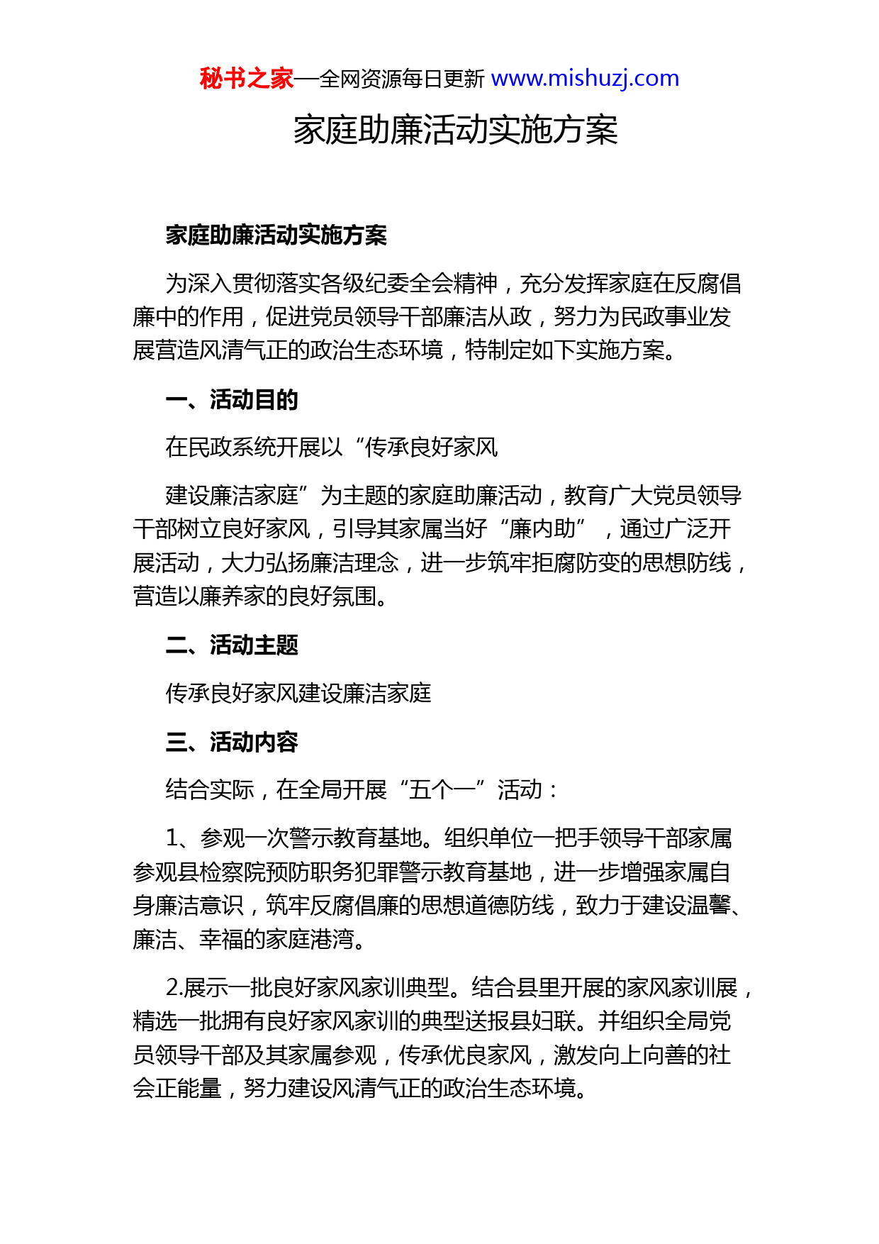 秘书之家—全网资源每日更新www.mishuzj.com家庭助廉活动实施方案家庭助廉活动实施方案为深入贯彻落实各级纪委全会精神,充分发挥家庭在反腐倡廉中的作用,促进党员领导干部廉洁从政,努力为民政事业发展营造风清气正的政治生态环境,特制定如下实施方案。一、活动目的在民政系统开展以“传承良好家风建设廉洁家庭”为主题的家庭助廉活动,教育广大党员领导干部树立良好家风,引导其家属当好“廉内助”,通过广泛开展活动,大力弘扬廉洁理念,进一步筑牢拒腐防变的思想防线,营造以廉养家的良好氛围。二、活动主题传承良好家风建设廉洁家庭三、活动内容结合实际,在全局开展“五个一”活动:1、参观一次警示教育基地。组织单位一把手领导干部家属参观县检察院预防职务犯罪警示教育基地,进一步增强家属自身廉洁意识,筑牢反腐倡廉的思想道德防线,致力于建设温馨、廉洁、幸福的家庭港湾。2.展示一批良好家风家训典型。结合县里开展的家风家训展,精选一批拥有良好家风家训的典型送报县妇联。并组织全局党员领导干部及其家属参观,传承优良家风,激发向上向善的社会正能量,努力建设风清气正的政治生态环境。秘书之家—全网资源每日更新www.mishuzj.com3、观看一次廉政影片。集中组织党员干部及家属观看《家财莫为子孙谋》、《家庭腐败警示录》专题教育片,促使党员领导干部筑牢廉洁从政的思想防线,促使党员干部家属守好廉洁的“后门”。4.发放一本廉政书籍。配合县妇联认真组织搜集具有影响力的中国传统家规家训事迹材料,编撰《中国传统中的家规》,向全局党员领导干部家庭发放,引导党员领导干部及家属遵纪守法,践行社会主义核心价值观。5、签订一批家庭助廉承诺书。由各县直单位妇委会、乡镇妇联具体负责,结合本单位实际,对新提拔和新进的领导班子成员签订家庭助廉承诺书一式三份(纪委、妇联、家属各存一份)。四、活动要求1、认真组织。各党支部要提高认识,切实加强对本次活动的组织和领导、科学制定方案,精心组织实施,确保活动实效。2、创新方式。要结合实际,创新活动载体,制定针对性、实效性强的活动方案,搭建活动平台,确保活动效果。3、强化落实。家庭助廉活动是廉政文化建设和宣传教育工作的一项重要内容,是惩防腐败体系建设的一个重要方面,各党支部按照方案要求,认真履行职责,抓好任务落实,务求工作落实到位。