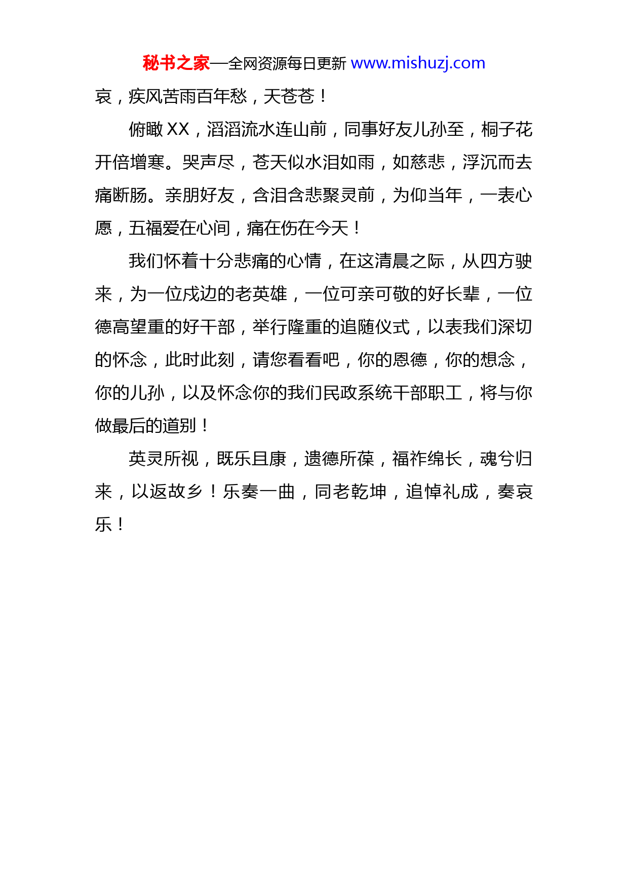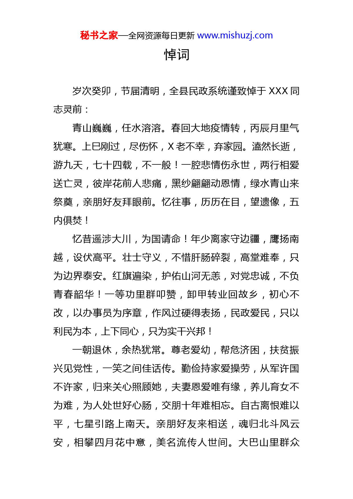 秘书之家—全网资源每日更新www.mishuzj.com悼词岁次癸卯,节届清明,全县民政系统谨致悼于XXX同志灵前:青山巍巍,任水溶溶。春回大地疫情转,丙辰月里气犹寒。上巳刚过,尽伤怀,X老不幸,弃家园。溘然长逝,游九天,七十四载,不一般!一腔悲情伤永世,两行相爱送亡灵,彼岸花前人悲痛,黑纱翩翩动恩情,绿水青山来祭奠,亲朋好友拜眼前。忆往事,历历在目,望遗像,五内俱焚!忆昔遥涉大川,为国请命!年少离家守边疆,鹰扬南越,设伏高平。壮士守义,不惜肝肠碎裂,高堂难奉,只为边界泰安。红旗遍染,护佑山河无恙,对党忠诚,不负青春韶华!一等功里群叩赞,卸甲转业回故乡,初心不改,以办事员为序章,作风过硬得表扬,民政爱民,只以利民为本,上下同心,只为实干兴邦!一朝退休,余热犹常。尊老爱幼,帮危济困,扶贫振兴见党性,一笑之间佳话传。勤俭持家爱操劳,从军许国不许家,归来关心照顾她,夫妻恩爱唯有缘,养儿育女不为难,为人处世好心肠,交朋十年难相忘。自古离恨难以平,七星引路上南天。亲朋好友来相送,魂归北斗风云安,相攀四月花中意,美名流传人世间。大巴山里群众秘书之家—全网资源每日更新www.mishuzj.com哀,疾风苦雨百年愁,天苍苍!俯瞰XX,滔滔流水连山前,同事好友儿孙至,桐子花开倍增寒。哭声尽,苍天似水泪如雨,如慈悲,浮沉而去痛断肠。亲朋好友,含泪含悲聚灵前,为仰当年,一表心愿,五福爱在心间,痛在伤在今天!我们怀着十分悲痛的心情,在这清晨之际,从四方驶来,为一位戍边的老英雄,一位可亲可敬的好长辈,一位德高望重的好干部,举行隆重的追随仪式,以表我们深切的怀念,此时此刻,请您看看吧,你的恩德,你的想念,你的儿孙,以及怀念你的我们民政系统干部职工,将与你做最后的道别!英灵所视,既乐且康,遗德所葆,福祚绵长,魂兮归来,以返故乡!乐奏一曲,同老乾坤,追悼礼成,奏哀乐!