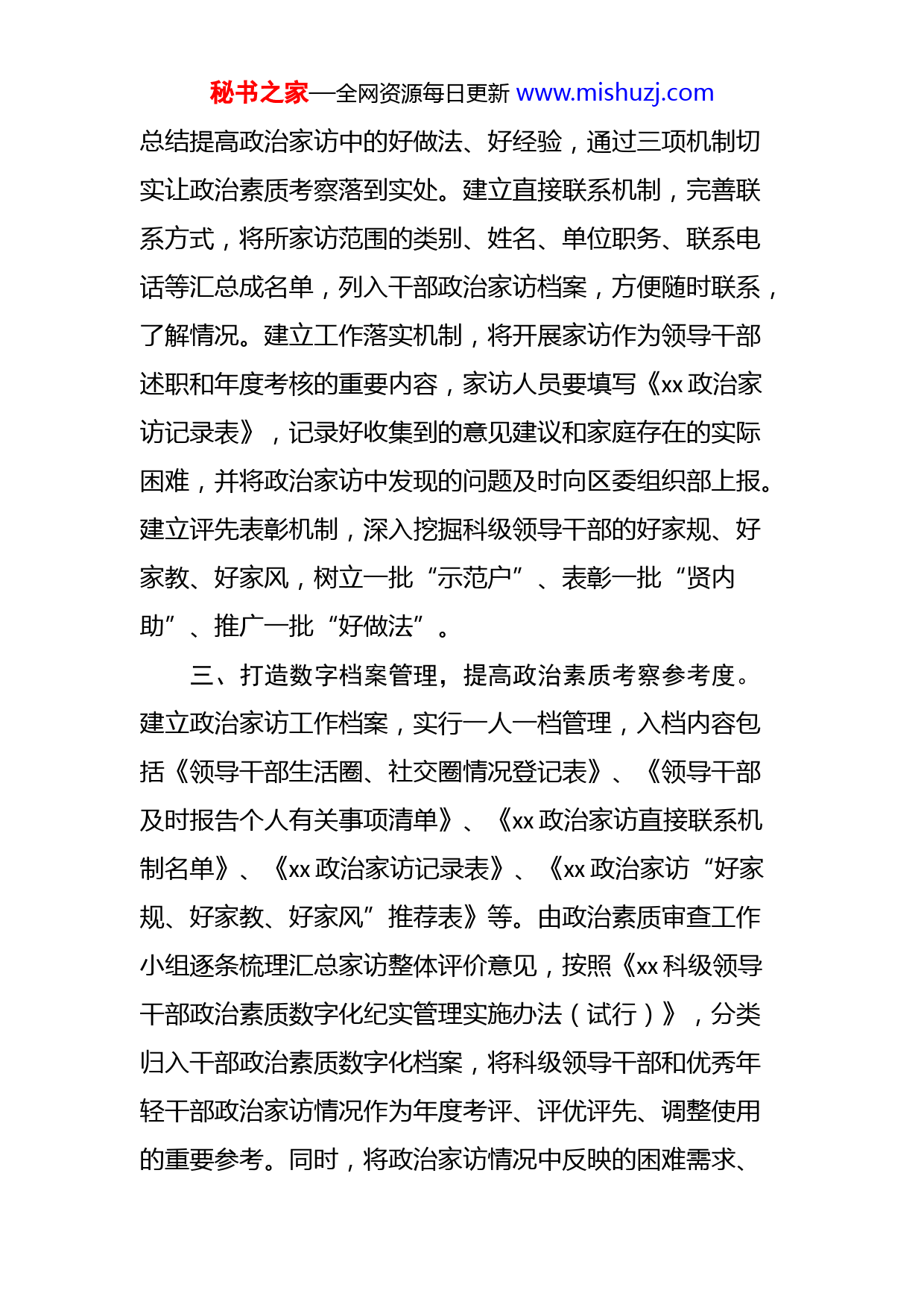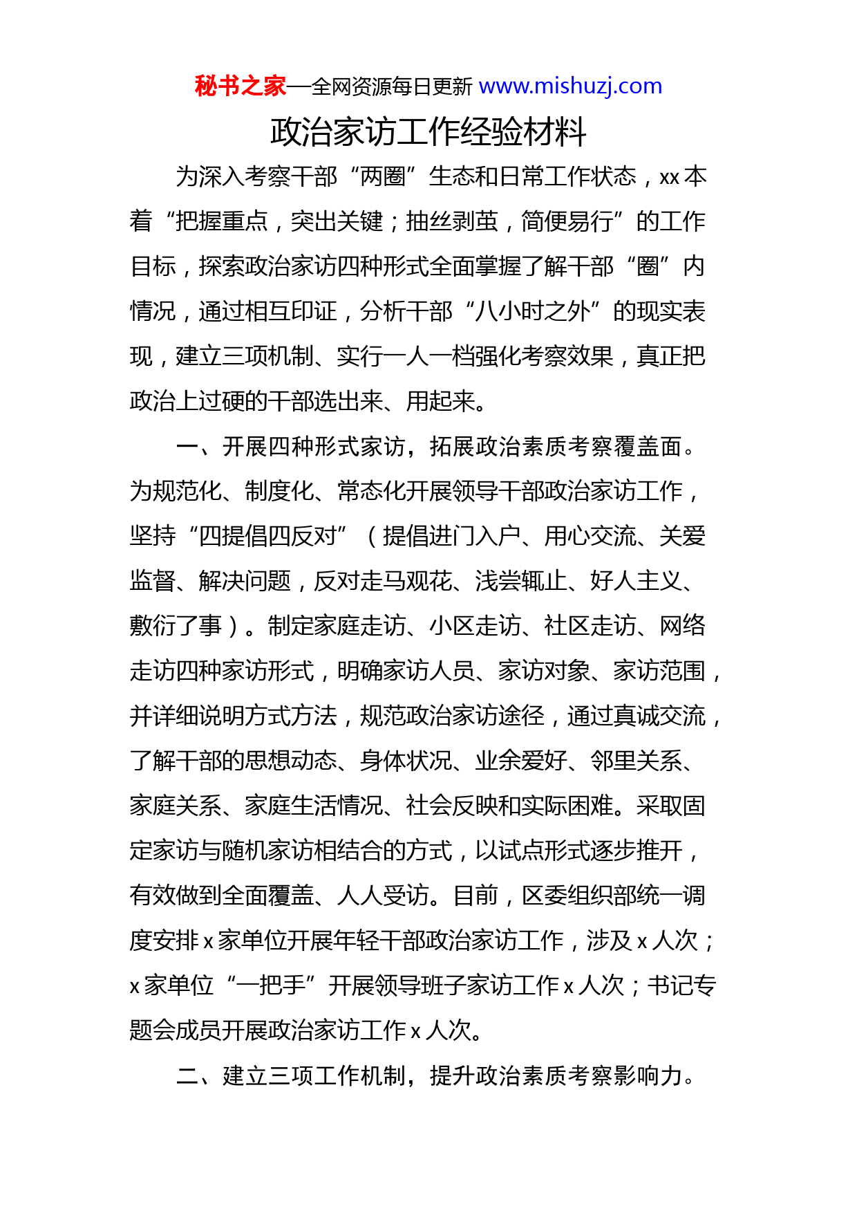 秘书之家—全网资源每日更新www.mishuzj.com政治家访工作经验材料为深入考察干部“两圈”生态和日常工作状态,xx本着“把握重点,突出关键;抽丝剥茧,简便易行”的工作目标,探索政治家访四种形式全面掌握了解干部“圈”内情况,通过相互印证,分析干部“八小时之外”的现实表现,建立三项机制、实行一人一档强化考察效果,真正把政治上过硬的干部选出来、用起来。一、开展四种形式家访,拓展政治素质考察覆盖面。为规范化、制度化、常态化开展领导干部政治家访工作,坚持“四提倡四反对”(提倡进门入户、用心交流、关爱监督、解决问题,反对走马观花、浅尝辄止、好人主义、敷衍了事)。制定家庭走访、小区走访、社区走访、网络走访四种家访形式,明确家访人员、家访对象、家访范围,并详细说明方式方法,规范政治家访途径,通过真诚交流,了解干部的思想动态、身体状况、业余爱好、邻里关系、家庭关系、家庭生活情况、社会反映和实际困难。采取固定家访与随机家访相结合的方式,以试点形式逐步推开,有效做到全面覆盖、人人受访。目前,区委组织部统一调度安排x家单位开展年轻干部政治家访工作,涉及x人次;x家单位“一把手”开展领导班子家访工作x人次;书记专题会成员开展政治家访工作x人次。二、建立三项工作机制,提升政治素质考察影响力。秘书之家—全网资源每日更新www.mishuzj.com总结提高政治家访中的好做法、好经验,通过三项机制切实让政治素质考察落到实处。建立直接联系机制,完善联系方式,将所家访范围的类别、姓名、单位职务、联系电话等汇总成名单,列入干部政治家访档案,方便随时联系,了解情况。建立工作落实机制,将开展家访作为领导干部述职和年度考核的重要内容,家访人员要填写《xx政治家访记录表》,记录好收集到的意见建议和家庭存在的实际困难,并将政治家访中发现的问题及时向区委组织部上报。建立评先表彰机制,深入挖掘科级领导干部的好家规、好家教、好家风,树立一批“示范户”、表彰一批“贤内助”、推广一批“好做法”。三、打造数字档案管理,提高政治素质考察参考度。建立政治家访工作档案,实行一人一档管理,入档内容包括《领导干部生活圈、社交圈情况登记表》、《领导干部及时报告个人有关事项清单》、《xx政治家访直接联系机制名单》、《xx政治家访记录表》、《xx政治家访“好家规、好家教、好家风”推荐表》等。由政治素质审查工作小组逐条梳理汇总家访整体评价意见,按照《xx科级领导干部政治素质数字化纪实管理实施办法(试行)》,分类归入干部政治素质数字化档案,将科级领导干部和优秀年轻干部政治家访情况作为年度考评、评优评先、调整使用的重要参考。同时,将政治家访情况中反映的困难需求、秘书之家—全网资源每日更新www.mishuzj.com意见建议分类建立清单,明确专人跟进处理解决,及时做好回复反馈,帮助干部解决问题,进一步激发干事创业热情,为全区经济社会各项事业发展提供坚实保障。