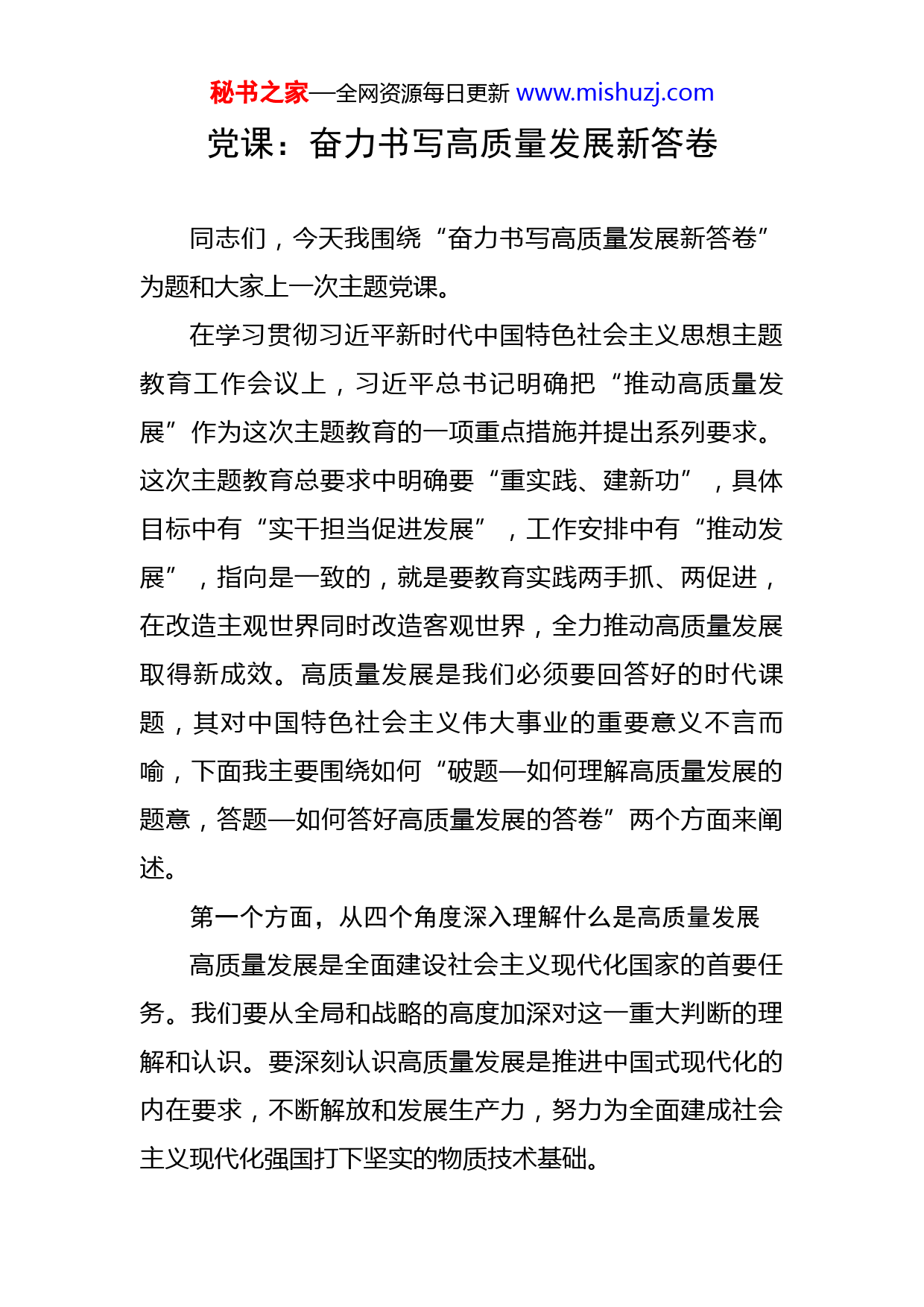 秘书之家—全网资源每日更新www.mishuzj.com党课:奋力书写高质量发展新答卷同志们,今天我围绕“奋力书写高质量发展新答卷”为题和大家上一次主题党课。在学习贯彻习近平新时代中国特色社会主义思想主题教育工作会议上,习近平总书记明确把“推动高质量发展”作为这次主题教育的一项重点措施并提出系列要求。这次主题教育总要求中明确要“重实践、建新功”,具体目标中有“实干担当促进发展”,工作安排中有“推动发展”,指向是一致的,就是要教育实践两手抓、两促进,在改造主观世界同时改造客观世界,全力推动高质量发展取得新成效。高质量发展是我们必须要回答好的时代课题,其对中国特色社会主义伟大事业的重要意义不言而喻,下面我主要围绕如何“破题—如何理解高质量发展的题意,答题—如何答好高质量发展的答卷”两个方面来阐述。第一个方面,从四个角度深入理解什么是高质量发展高质量发展是全面建设社会主义现代化国家的首要任务。我们要从全局和战略的高度加深对这一重大判断的理解和认识。要深刻认识高质量发展是推进中国式现代化的内在要求,不断解放和发展生产力,努力为全面建成社会主义现代化强国打下坚实的物质技术基础。秘书之家—全网资源每日更新www.mishuzj.com(一)从系统思维的角度来全面理解。高质量发展不只是一个经济要求,而是对经济社会发展方方面面的总要求;不只是对经济发达地区的要求,而是所有地区发展都必须贯彻的要求;不是一时一事的要求,而是必须长期坚持的要求。完整、准确、全面贯彻新发展理念,着力推动高质量发展,是习近平经济思想的重要内容。我们要深入开展学习贯彻习近平新时代中国特色社会主义思想主题教育,切实把握高质量发展的实践内涵,着力提高推动高质量发展的能力和水平,把党中央各项决策部署落到实处,推动高质量发展不断取得新成效。(二)从现实需要的角度来加深理解。高质量发展是跨越重大关口的必然选择,加快质量变革、效率变革、动力变革,推动经济在高质量发展轨道上行稳致远。要深刻认识高质量发展是赢得战略优势的关键所在,着力增强经济竞争力、创新力、抗风险能力,以高质量发展的确定性应对外部形势的不确定性。要统筹推动经济运行持续好转、内生动力持续增强、社会预期持续改善、风险隐患持续化解,乘势而上,推动经济实现质的有效提升和量的合理增长。(三)从具体实践的角度来强化理解。高质量发展具有丰富的实践内涵。要自觉把新发展理念贯穿到经济社会发展全过程,始终以创新、协调、绿色、开放、共享的内秘书之家—全网资源每日更新www.mishuzj.com在统一来把握发展、衡量发展、推动发展。要坚持质量第一、效益优先,推动经济实现质的有效提升和量的合理增长。要坚定不移深化改革开放、深入转变发展方式,加快建设现代化产业体系,更好统筹发展和安全,努力使发展动力更强、发展方式更优。要扎扎实实做好保障和改善民生工作,让人民群众实实在在感受到高质量发展成果。要持续增强“四大功能”,提升城市核心竞争力。工业要稳住基本盘,新兴产业要发挥引领作用,服务业要大力提升能级,加快培育一批龙头企业和高增长企业,形成经济高质量发展新动能。(四)从长远发展的角度来延伸理解。推动高质量发展具有战略性、长期性,必须掌握正确的工作策略和方法,着力提高推动高质量发展的能力和水平。要强化系统观念,提高工作协同性,凡事多作整体性、综合性考量。要找准工作突破口,积极谋划具有牵引性撬动性的载体和抓手。要增强工作穿透力,以深入开展主题教育为契机,大兴调查研究,切实改进作风,以改革创新的思路举措,实打实地解决一批突出问题。充分释放政策效应,让经营主体有更强的获得感。同时,优化营商环境要持续发力,各级领导干部要把塑造一流营商环境作为“一把手”工程切实抓紧抓好,让企业敢闯、敢试、敢干。把发挥政策效力和激发经营主体活力结合起来,形成推动高质量发展的秘书之家—全网资源每日更新www.mishuzj.com强大动力。第二个方面,从四个方面发力答好高质量发展答卷当前,我国已经开启全面建设社会主义现代化国家新征程。建设现代化国家新使命要求我们在高水平改革开放中加快实现高质量发展,以高质量发展引领中国式现代化。我们必须从立足新发展阶段、贯彻新发展理念、构建新发展格局的高度,把握高质量发展的丰富内涵和现实要求,推动高质量发展落地落实落细。(一)要拿出“舍我其谁”的勇气,突出强化改革引领。坚持以率先探索更高水平的改革开放为己任,大胆试、大胆闯、自主改,奋力为构建高水平社会主义市场经济体制探路破局,坚定不移向改革深水区挺进,探索实施市场主体登记确认制、市场准营承诺即入制、承诺制注销、强制注销等新一批商事制度改革,探索审批改革“两证合一”等首创性举措,持续深化面向市场的“放管服”改革和政府自身的体制机制改革,注重改革系统集成,从事物发展的全过程、产业发展的全链条、企业发展的全生命周期出发来谋划设计改革,围绕“办成一件事”推进各部门各领域协同放权、放管衔接、联动服务,立足“做强一个产业”开展行业整体性制度创新。(二)要锚定“精益求精”的追求,突出强化创新引领。近年来