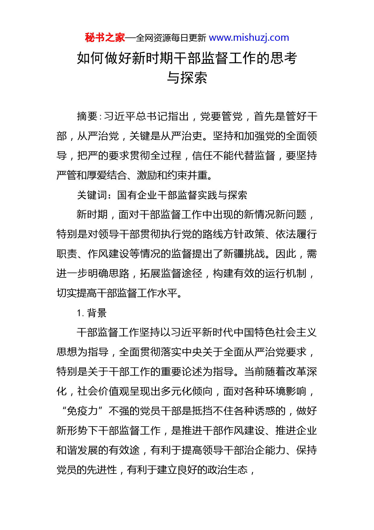 秘书之家—全网资源每日更新www.mishuzj.com如何做好新时期干部监督工作的思考与探索摘要:习近平总书记指出,党要管党,首先是管好干部,从严治党,关键是从严治吏。坚持和加强党的全面领导,把严的要求贯彻全过程,信任不能代替监督,要坚持严管和厚爱结合、激励和约束并重。关键词:国有企业干部监督实践与探索新时期,面对干部监督工作中出现的新情况新问题,特别是对领导干部贯彻执行党的路线方针政策、依法履行职责、作风建设等情况的监督提出了新疆挑战。因此,需进一步明确思路,拓展监督途径,构建有效的运行机制,切实提高干部监督工作水平。1.背景干部监督工作坚持以习近平新时代中国特色社会主义思想为指导,全面贯彻落实中央关于全面从严治党要求,特别是关于干部工作的重要论述为指导。当前随着改革深化,社会价值观呈现出多元化倾向,面对各种环境影响,“免疫力”不强的党员干部是抵挡不住各种诱惑的,做好新形势下干部监督工作,是推进干部作风建设、推进企业和谐发展的有效途,有利于提高领导干部治企能力、保持党员的先进性,有利于建立良好的政治生态,秘书之家—全网资源每日更新www.mishuzj.com2.主要特点及现状党的十八大以来,从中央到地方均加强了干部监督工作,干部监督工作取得长足发展,领导干部的责任意识、廉政意识、服务意识明显增强。但也呈现出基本特点如:干部监督管理权较为集中。二级单位领导干部由上一级行进行选拔任用和管理考核,基层领导干部出现问题,也由上级行进行检查处理;干部监督管理幅度较大。由于行业和工作的特殊性,经营区域和管理范围、点多面广,干部监督管理的幅度较大、范围较广、难度较大;干部监督的方法手段较为单一。主要集中在党内监督,群众和媒体舆论监督还不广泛。同时存在主要问题如:监督的意识不强,存在“重选轻管”的问题;监督的力度不够;党内批评与自我批评的力度不够,上级监督不到,同级监督不力,群众监督不了的现象依然存在。毛泽东同志在《反对党内的资产阶级思想》中指出:“无论任何人,犯了错误都要检讨,都要受党的监督”。有些领导干部自觉接受监督的意识不强,不愿主动接受监督。干部监督主要把“廉洁不廉洁”当成重要内容,而忽略了对“八小时外”的监督;监督的滞后性,惩治性的事后监督比较集中,而预防性的事前、事中监督少,监督工作忙于“救火”;“大监督”工作合力不足,不同的监督主体职能重点不同,监督信息和资源集中不够,监督成果共享不明显。秘书之家—全网资源每日更新www.mishuzj.com3.新形势下干部监督的主要内容3.1组织部门是党委主管干部工作的职能部门,对干部监督工作负有首要职责,要聚焦本单位中基层领导班子及班子成员、关键少数以及年轻干部开展监督。3.2新形势下干部监督要围绕“一个中心、三个重点”组织开展。一个中心”,就是要始终围绕党的中心工作开展,服从于党的总任务和总目标。作为国有企业,新时期党的干部监督工作,就是要努力践行在经济领域为党工作的初心和使命,扛稳压实“三大责任”,打造一支忠诚干净担当的干部队伍。“三个重点”,即要围绕重大决策、重要干部任免、重要建设项目和大额资金的使用进行监督。同时对重点时间实行专项监督,如领导干部婚丧喜庆、逢年过节,还有所谓“59岁现象”的情况。对领导班子的监督。重点从“政治思想、领导能力、党风廉政、作风形象、工作实绩”等方面开展。即严守党的政治纪律和政治规矩、坚决落实中央方针政策、落实第一议题制度情况、坚持民主集中制原则、班子整体功能发挥情况、执行党内政治生活情况、执行新时代党的组织路线、执行领导人员选拔任用情况,重大事项请示报告情况,生产经营任务目标完成情况,贯彻执行财经纪律,依法合规经营情况,党风廉政建设责任制等情况开展监督。对领导干部的监督。重点围绕“对党忠诚、勇于创新、治企有方、兴企秘书之家—全网资源每日更新www.mishuzj.com有为、清正廉洁”好干部标准开展监督。突出对党忠诚”的监督,领导干部带头做到“六个一”(第一时间学习研究、第一时间发声响应、第一时间拿出措施、第一时间推动落实、第一时间发现解决问题、第一时间取得实效)进行重点监督。4.新形势下干部监督实践与探索4.1在政治监督上。要坚持把政治监督摆在首位。习近平总书记强调,要强化政治监督,维护党中央权威和集中统一领导,确保党中央决策部署落实到位。因此,要把政治监督作为新时代干部监督工作的首要职责,加强在政治立场、政治忠诚、政治责任、政治生态的监督,严明党的政治纪律和政治规矩。如何做好政治监督,既要盯紧“关键少数”,也要抓住“绝大多数”。党员领导干部作为“关键少数”,起到了“领头雁”“排头兵”的作用,但作为“绝大多数”的普通干部,手中没有很大的权力,但党的决策部署、方针政策需要靠他们去打通“最后一公里”。因此,“关键少数”和“绝大多数”一个都不能少。要抓实政治理论学习,坚定政治信仰。对于党员干部来讲,政治信仰始终是第一位的,必须用坚定的马克思主义信仰和共产主义理想立起政治思想之魂。通过落实“第一议题”制度、个人自学、专题研讨、“三会一课”、思政微课堂等教育载体,深入开展理想信念