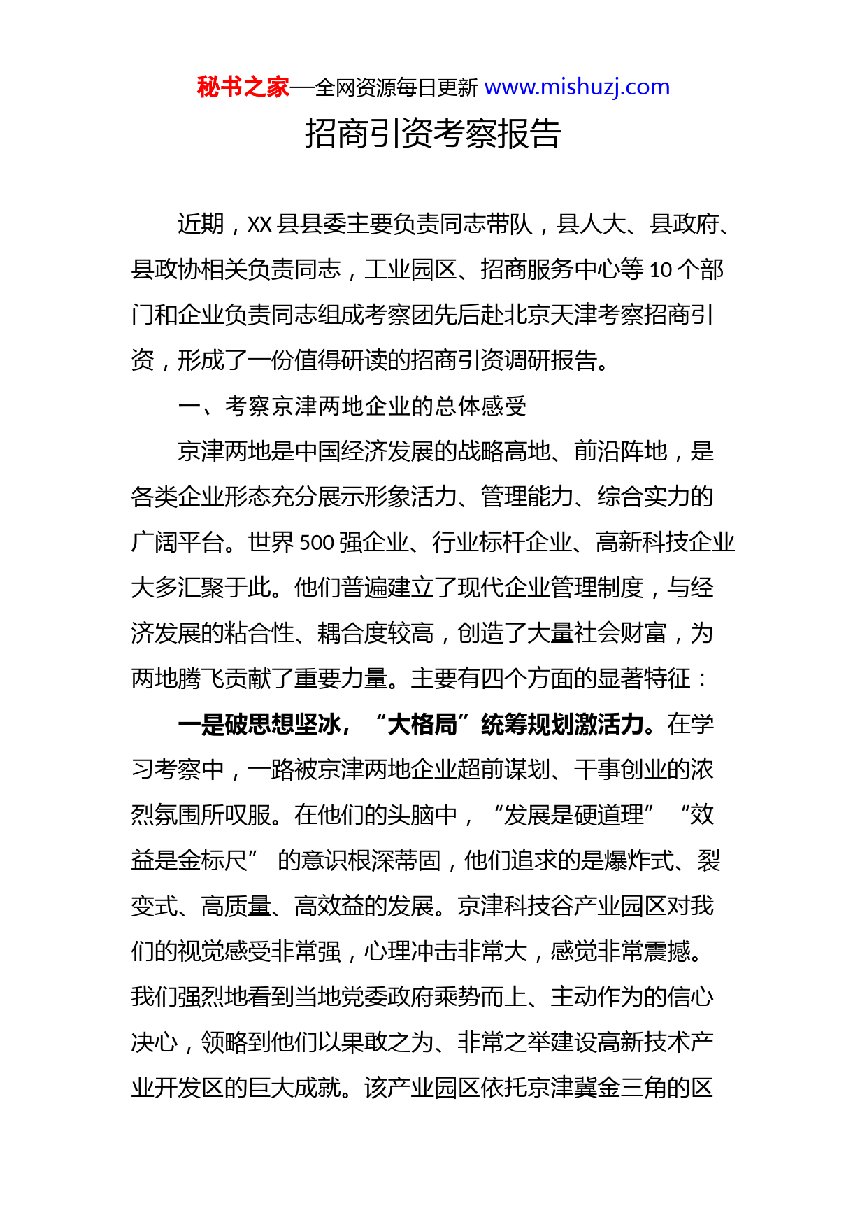 秘书之家—全网资源每日更新www.mishuzj.com招商引资考察报告近期,XX县县委主要负责同志带队,县人大、县政府、县政协相关负责同志,工业园区、招商服务中心等10个部门和企业负责同志组成考察团先后赴北京天津考察招商引资,形成了一份值得研读的招商引资调研报告。一、考察京津两地企业的总体感受京津两地是中国经济发展的战略高地、前沿阵地,是各类企业形态充分展示形象活力、管理能力、综合实力的广阔平台。世界500强企业、行业标杆企业、高新科技企业大多汇聚于此。他们普遍建立了现代企业管理制度,与经济发展的粘合性、耦合度较高,创造了大量社会财富,为两地腾飞贡献了重要力量。主要有四个方面的显著特征:一是破思想坚冰,“大格局”统筹规划激活力。在学习考察中,一路被京津两地企业超前谋划、干事创业的浓烈氛围所叹服。在他们的头脑中,“发展是硬道理”“效益是金标尺”的意识根深蒂固,他们追求的是爆炸式、裂变式、高质量、高效益的发展。京津科技谷产业园区对我们的视觉感受非常强,心理冲击非常大,感觉非常震撼。我们强烈地看到当地党委政府乘势而上、主动作为的信心决心,领略到他们以果敢之为、非常之举建设高新技术产业开发区的巨大成就。该产业园区依托京津冀金三角的区秘书之家—全网资源每日更新www.mishuzj.com位优势,抢抓协同发展叠加机遇,率先打破行政区域界限、对接资源要素,创新推广了“产、学、研、人才、金融”五位一体发展模式,实现了产业集群联动发展,先后引进企业2000多家,500强企业10家,国内外龙头企业30多家,累计吸纳就业2.2万人,成为京津之间的创业之谷、科技之谷和生活之谷。二是筑开放高地,“大手笔”聚智引资增动力。京津两地企业在发展壮大中都能够立足自身实际,扩大区域合作,广招贤能英才,招大商、引大资、上大项,实现了经济总量的快速扩张,提升了综合竞争力。我们考察的国桃示范基地,是著名的“北京七号”的原产地。在每年4月下旬,举办桃花国际旅游节,吃住娱游消费一体化,极大带动了当地文旅深度融合发展,品牌价值达101.84亿元。桃园还作为中国农业大学、北京农学院等农业高等院校的户外实训基地,每年有数百名博士、研究生等高端人才来此工作、学习。我们考察的中国平谷农业中关村,围绕建设一流的数智化、国际化、生态化农业科技园区,以培育发展现代种业、智慧农业、智能装备、生物技术、营养健康、食品安全等六大产业为主、产业综合配套为辅,进一步创新招商方式,提升引资水平,优化营商环境。2022年,平谷区引进涉农企业80家,聚集国家级种业研发平台9个、省部级以上工程技术中心和实验室4个、高端科研创新团队秘书之家—全网资源每日更新www.mishuzj.com21个,建成13个科技小院和45个“博士”农场,汇聚11位院士和175名博士,真正使农业中关村成为了让梦想生长的创新之城。三是强产业集群,“大运作”蓄势赋能提内力。按照产业化的思路,发展规模经济,以此提升区域经济质量是我们考察团所到之处的最大感受。我们本次考察的绫致时装(天津)有限公司,是欧洲最大的时装集团在天津设立的全资子公司,至今在武清已经营了25个年头。公司坚持新兴产业和传统产业并举、提升能级和增强品质并重、制造业和服务业融合,大力推动制造业高端化、智能化、绿色化发展,为工业经济快速发展注入了强劲动能。2022年公司销售收入139亿元,仅1月就月售15亿元,纳税6900万元,超额完成销售目标。目前公司已经走在数字化转型前沿,线上销售蒸蒸日上,累计实现营业收入2530亿元。特别是近年来,公司聚力打通上下游产业链“中梗阻”,通过完善产业链、加强人才培养、技术转型升级等举措,培育发展新动力,带动上下游关联企业,助推产业集群加快形成。投资7700万美元建成了武清物流中心,在2022年为全产业链创造价值近50亿元,拉动消费百亿元。综合考量服装这个产业集群在天津武清的成长壮大历程,可以发现,他们及时、有效地整合了原始资本积累、对外贸易、品牌效应等初级的、浅层次的、松散型的资源状况,在短秘书之家—全网资源每日更新www.mishuzj.com时间内释放了产业集聚的辐射带动作用,使服装产业迅速成为天津市的支柱产业。四是聚资源要素,“大规模”加速进位铸合力。考察团所到之处,在感受到浓烈发展氛围的同时,更看到了他们不断蓄积发展后劲、增强可持续发展能力、积极培育和开发新经济增长点的与时俱进的风采。北京、天津以现代服务业提升传统产业,以大商贸聚合人流、物流、资金流、信息流、财富流,形成倍增效应。我们考察的京东集团,是中国最大的自营式电商企业,提供涵盖各个主要类别的大量产品,借助其强大的全国物流网络和成熟的数据驱动交付技术,为消费者提供真正的“一站式”购物服务。目前京东集团正在探索建立县级种养殖基地,为物流行业快速发展提供充足丰盈的实物保障。基于此,以京东物流为代表的快递平台经济站在了新的风口,步入了快速成长期,科学发展、可持续发展的新优势正在不断显现。考察的新发地农副产品批发市场,高峰时年果品交易值达到1738亿元,相当于内蒙古一年的GDP总值。该市场细分规划了肉类、蔬菜、果品等交易市场,最大限度整合了资源要素,实现了大型农副产品交易的规范化