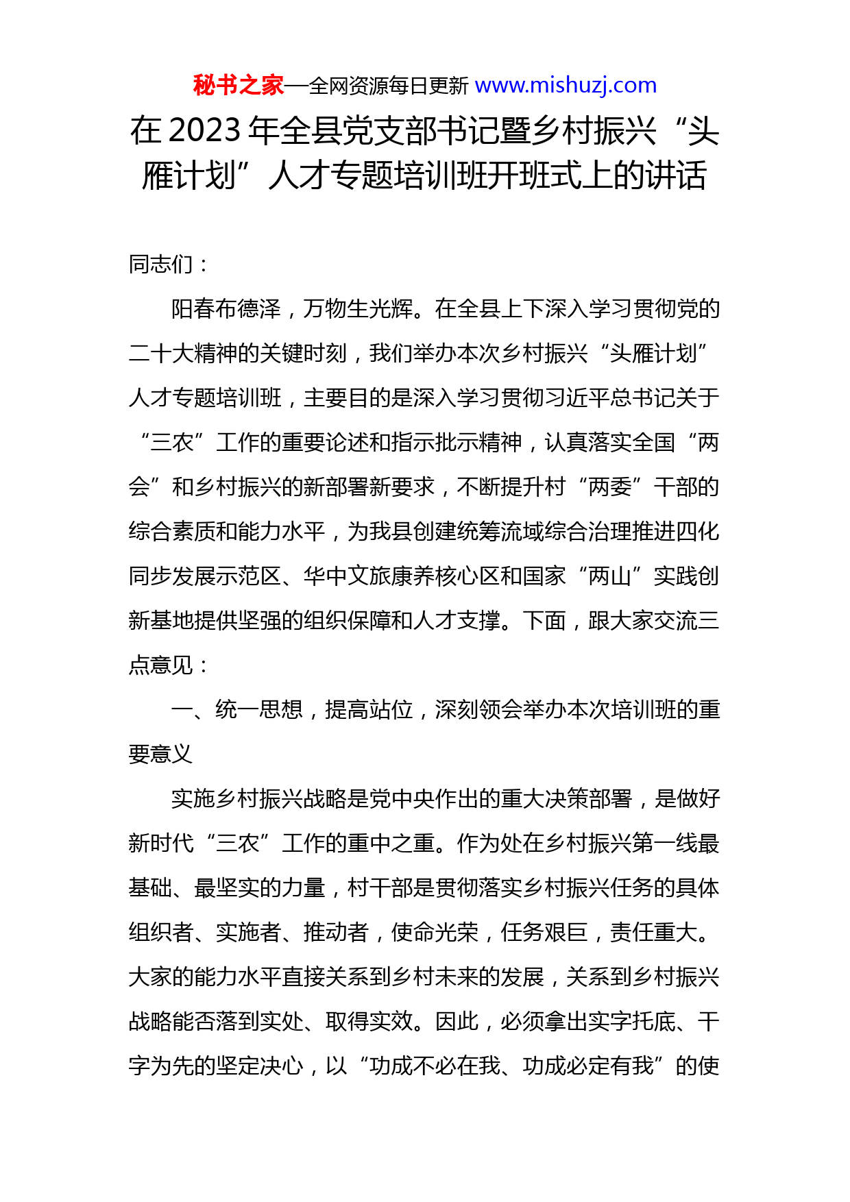 秘书之家—全网资源每日更新www.mishuzj.com在2023年全县党支部书记暨乡村振兴“头雁计划”人才专题培训班开班式上的讲话同志们:阳春布德泽,万物生光辉。在全县上下深入学习贯彻党的二十大精神的关键时刻,我们举办本次乡村振兴“头雁计划”人才专题培训班,主要目的是深入学习贯彻习近平总书记关于“三农”工作的重要论述和指示批示精神,认真落实全国“两会”和乡村振兴的新部署新要求,不断提升村“两委”干部的综合素质和能力水平,为我县创建统筹流域综合治理推进四化同步发展示范区、华中文旅康养核心区和国家“两山”实践创新基地提供坚强的组织保障和人才支撑。下面,跟大家交流三点意见:一、统一思想,提高站位,深刻领会举办本次培训班的重要意义实施乡村振兴战略是党中央作出的重大决策部署,是做好新时代“三农”工作的重中之重。作为处在乡村振兴第一线最基础、最坚实的力量,村干部是贯彻落实乡村振兴任务的具体组织者、实施者、推动者,使命光荣,任务艰巨,责任重大。大家的能力水平直接关系到乡村未来的发展,关系到乡村振兴战略能否落到实处、取得实效。因此,必须拿出实字托底、干字为先的坚定决心,以“功成不必在我、功成必定有我”的使秘书之家—全网资源每日更新www.mishuzj.com命担当,扎实推动乡村振兴战略落地落实、开花结果。俗话说,“工欲善其事,必先利其器”,“磨刀不误砍柴工”,之所以举办这次培训班,我想主要是基于以下三个方面的考虑。一是贯彻落实党的二十大精神的大局需要。习近平总书记在党的二十大报告中强调,要“坚持农业农村优先发展,巩固拓展脱贫攻坚成果,加快建设农业强国,扎实推动乡村产业、人才、文化、生态、组织振兴”。2月13日发布的2023年中央一号文件《中共中央、国务院关于做好2023年全面推进乡村振兴重点工作的意见》,要求“必须坚持不懈把解决好‘三农’问题作为全党工作重中之重,举全党全社会之力全面推进乡村振兴,加快农业农村现代化”,并就全面推进乡村振兴作出了安排部署,明确了目标任务。省委也于日前发布了《XX省流域综合治理和统筹发展规划纲要》,这是我省构建江河安澜、山川灵秀、协调有序、美丽宜居的新发展格局的纲领性、统领性规划。面对新形势、新挑战、新要求,村“两委”干部必须加强政策理论学习,拓宽知识眼界,创新工作思路,提升能力水平。集中培训是乡村干部汲取知识、成长进步的重要平台,大家要以此次培训为契机,在专家授课中提高理论水平,在实地观摩中总结经验启示,在学习交流中碰撞思想火花,不断提高自身解决实际问题的能力,锻造务实重行、善作善成的过硬本领。二是促进乡村高质量发展的现实需要。党的十八大以来,秘书之家—全网资源每日更新www.mishuzj.com以习近平同志为核心的党中央坚持把解决好“三农”问题作为全党工作的重中之重,全面打赢脱贫攻坚战,推动农业农村取得历史性成就、发生历史性变革。然而,脱贫摘帽不是终点,而是新生活、新征程的起点。乡村振兴既是高质量发展阶段一项意义重大、影响深远的战略任务,也是构建新发展格局、践行新发展理念的内在要求。进入全面推进乡村振兴、加快农业农村现代化的新阶段,大家要围绕如何贯彻落实中央和省、市、县各级决策部署,聚焦产业发展和基层治理的焦点难点问题,尤其是在加强农村基层党组织建设、发展壮大村集体经济、促进社会和谐稳定等方面深入思考剖析,拿出解决方案。举办这次培训班,就是给大家提供一次学习典型经验、找准自身差距、明晰发展路径的宝贵机会,引导大家聚焦问题本质深入交流探讨。三是提升乡村干部能力素质的客观需要。当前,乡村干部面临最大的挑战是能力挑战,最大的危机是本领危机,最大的恐慌是知识恐慌。进入新发展阶段,全面推进乡村振兴、美好生活共同缔造等工作都对村干部提出了新要求,一些村干部在思想、能力、作风等方面与这些要求还不适应,如果不注意学习吸收新知识、新理念,就会导致在面对新问题、新情况时一筹莫展、束手无策。因此,大家要牢固树立学以立身、学以致用、学用结合的思想观念,充分利用好本次培训机会,转变工作学习作风,跟上形势发展变化,提升履职尽责水平。举办这秘书之家—全网资源每日更新www.mishuzj.com次培训班,目的就是提高村干部干事创业的能力和示范引领的能力,聚焦全县中心大局和重点工作任务,充分发挥大家的聪明才智,为全面推进实施乡村振兴作出更大贡献。二、立足本职,聚焦发展,充分发挥乡村振兴“领头雁”作用“火车跑得快,全靠车头带”,村党支部书记和广大村干部要充分发挥乡村振兴“领头雁”作用,把思想统一到想干事上,做党性坚强的“当家人”;把能力体现在会干事上,做产业发展的“带头人”;把目标落实到干成事上,做强村富民的“引路人”,用实际行动诠释服务乡村振兴的使命与担当。一要当好党建引领的“主心骨”。办好农村的事情,实施乡村振兴,关键要充分发挥党建引领作用。总结经验启示,我们不难发现,党建工作扎实有效,乡村振兴就会蹄疾步稳;党建工作软弱无力,乡村振兴就会步履维艰。基层党组织是实施乡村振兴战略的“主心骨”,村干部特别是村党支部书记作为乡村发展的“领头雁”、强村富民的“引